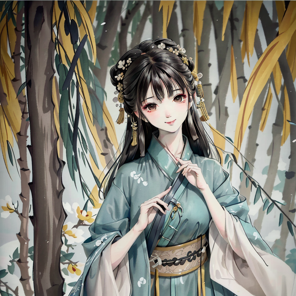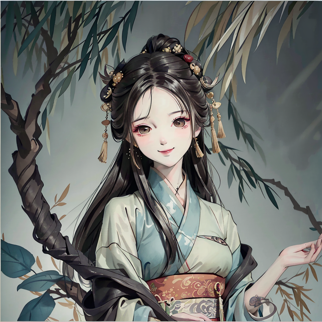 negative space, portrait of a woman standing , willow branches, (masterpiece, best quality:1.2), traditional chinese ink painting,modelshoot style, peaceful, (smile), looking at viewer, wearing long hanfu, hanfu, song, willow tree in background,shuimobysim,<lora:MoXinV1:0.8>
