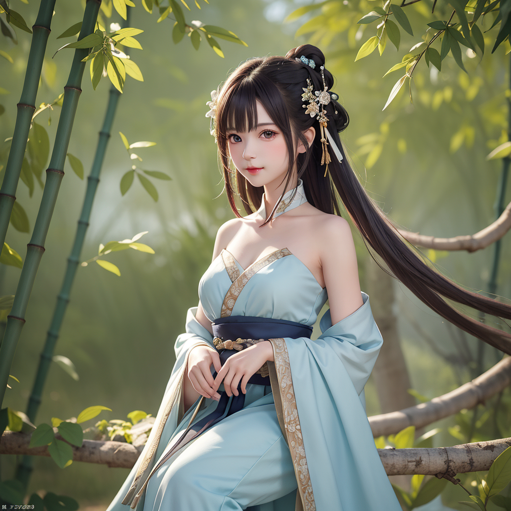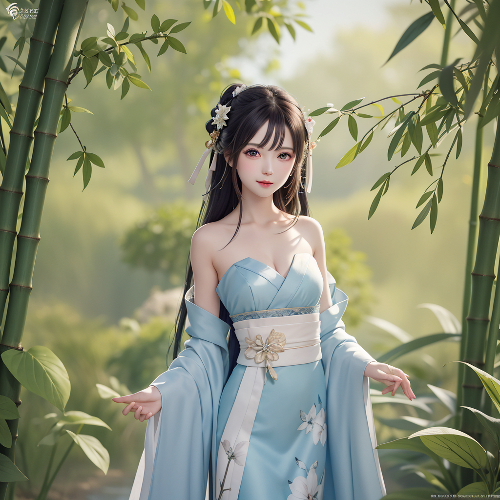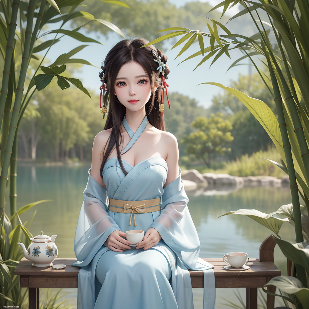 <lora:MoxinV1:0.4> ,<lora:shukezouma_v1_1:0.4>,shukezouma,shuimobysim,masterpiece, best quality, official art, 8k wallpaper, highly detailed, illustration, 1 girl, Azure hair, long hair, detailed eyes, forrest, bare shoulders, hanfu,lakes, pure, soft smile,bamboo,Tea