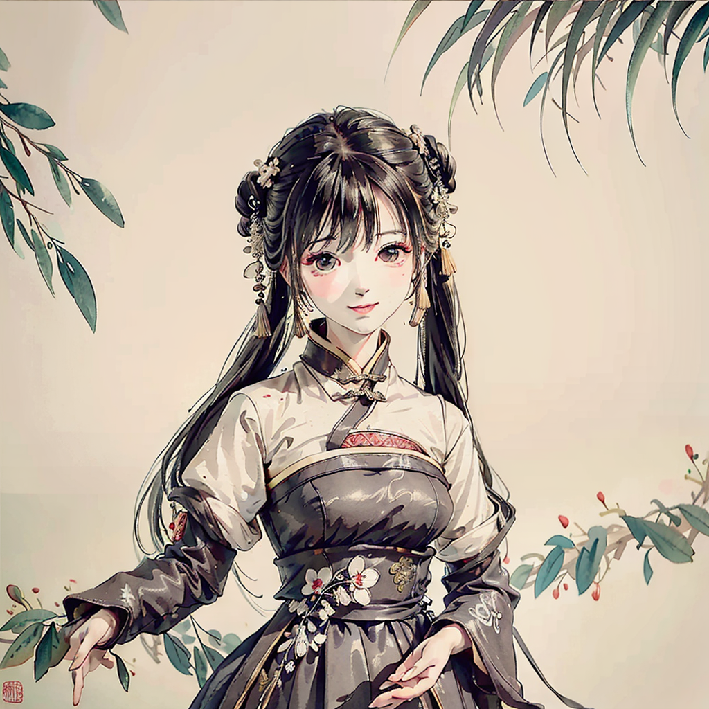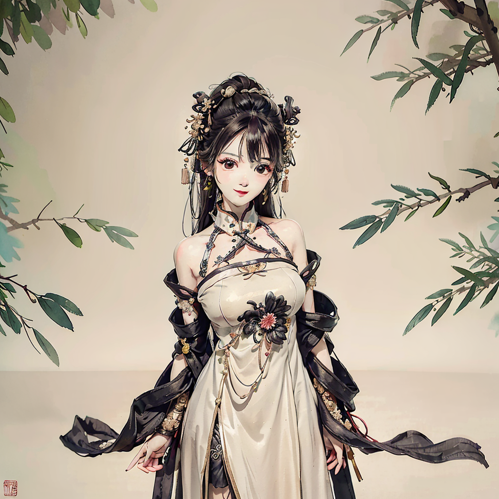 negative space, portrait of a woman standing , willow branches, (masterpiece, best quality:1.2), traditional chinese ink painting, modelshoot style, peaceful, (smile), looking at viewer, (wedding dress:0.8), (mechanical exoskeleton:1),song, willow tree in background, wuchangshuo, <lora:shukezouma_v1_1:0.7>, <lora:MoXinV1:0.65>