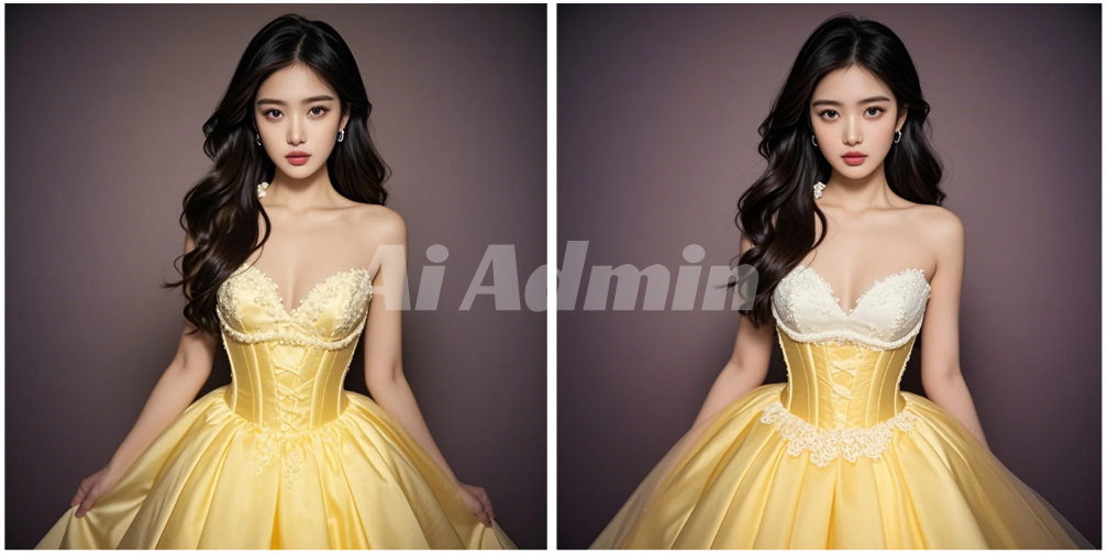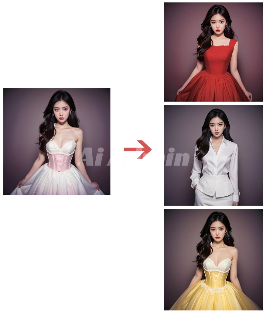 输入服装提示词:把XXX变成XXX。如:把裙子变成红色,把裙子变成西装衬衫+西装群,把裙子变成黄色婚纱等
